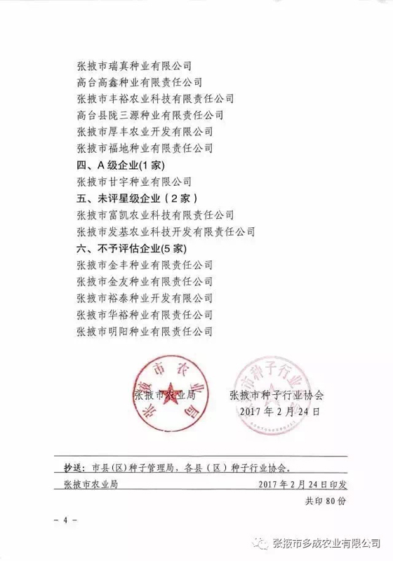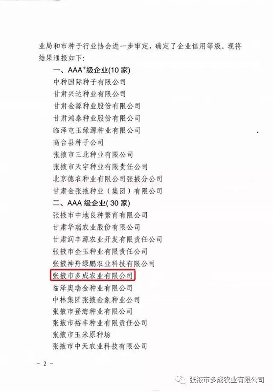 | 熱烈祝賀張掖市多成農(nóng)業(yè)有限公司被評(píng)為2017年度信用等級(jí)AAA級(jí)企業(yè)。 | ||